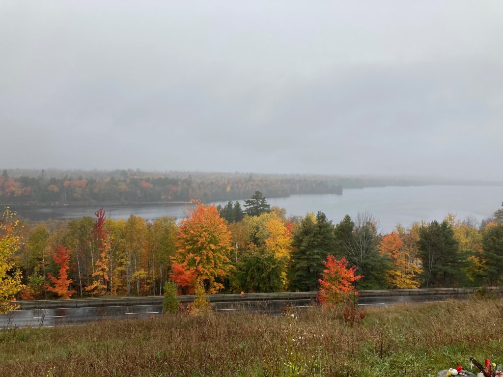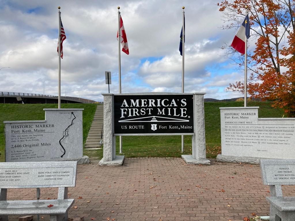 I left Bangor early and headed up Route 11 through beautiful Fall scenery. Many, many trees. Not very many people. All the way up to Fort Kent and Mile 1 of US Route 1.