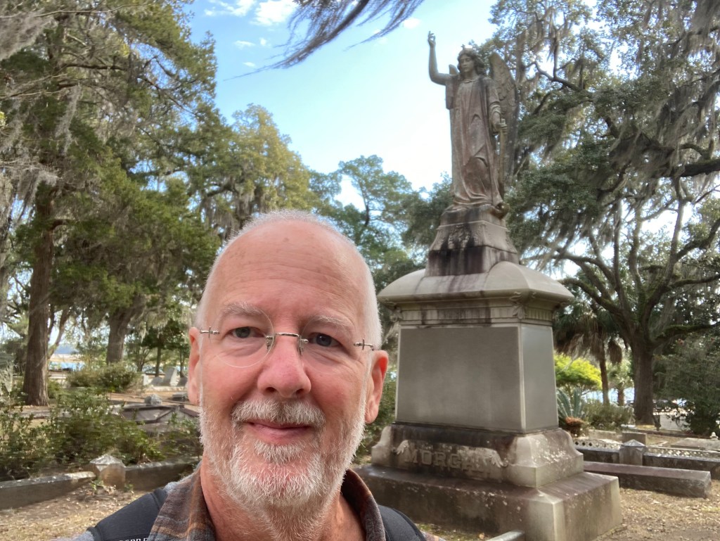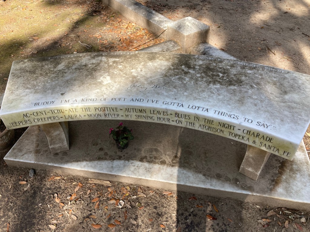 I spent two or three hours in Bonaventure Cemetery, made famous in Midnight in the Garden of Good and Evil? That’s the cemetery at the top of the page and below. You’ll need to drive out to the cemetery, but I wouldn’t miss it. I didn’t take a formal tour, but next time I come back I will. Too much to grasp solo. Johnny Mercer is under the bench to the right.