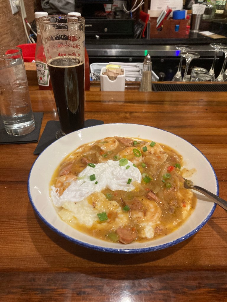 Shrimp and grits with a poached egg. And a brown ale. Pooban’s Porch.
