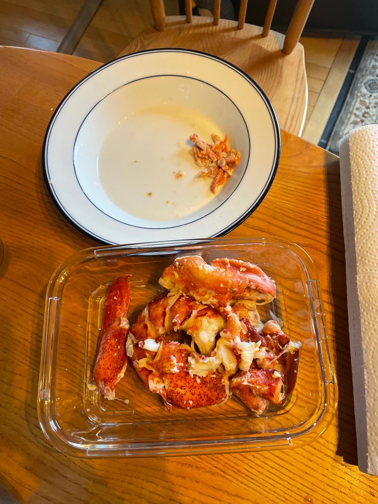 Lobster. Whenever Brittany was able to come back to Maine, it became tradition for the three of us to have lobster. On the 19th, we cooked three; for Brittany, me, and a spare. In the past, Brittany and I would retire to the couch and some TV, while Janelle sat at the kitchen table and cleaned the remaining lobster shells for what seemed like a couple of hours. She always came away with enough meat for lobster rolls. So here was another life skill that we never bothered to learn, but really, we could figure it out. Brittany cleaned the claws and the tails – that would be the decent looking haul below. I tackled the legs and bodies – that would be the disgraceful pittance below. Thank goodness for the spare bug – see lobster roll at top of page. I plan to try again with some harder shell creatures before admitting defeat. I’m concerned the odds may not be in my favor.