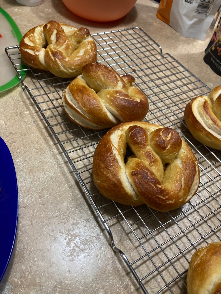 Yesterday Ty and I learned about making soft pretzels. Some excellent practical mathematics, applied chemistry, and just plain fun trying to roll dough, shape a pretzel, dip in boiling sodium bicarbonate-water, egg wash, salt, bake, and have the finished product resemble a pretzel. Visual success. And tasted great!