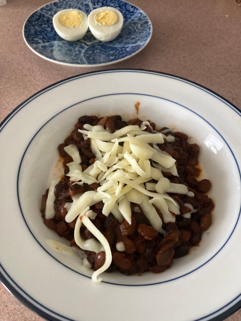 As further acknowledgement, but back at the condo, local Maine black pigeon and white navy beans, molasses, and assorted peppers, of course topped with cheese. And some hard boiled eggs. Living large.