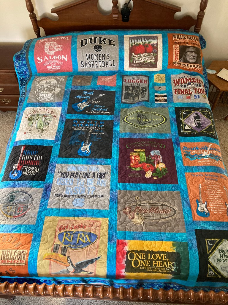 I pulled t-shirts of Janelle’s, and of mine, that spanned some of our special times. Music, Travel, Basketball, Food, the Common Ground Fair. Jessica found me Stitches by Stiles to make a quilt.
