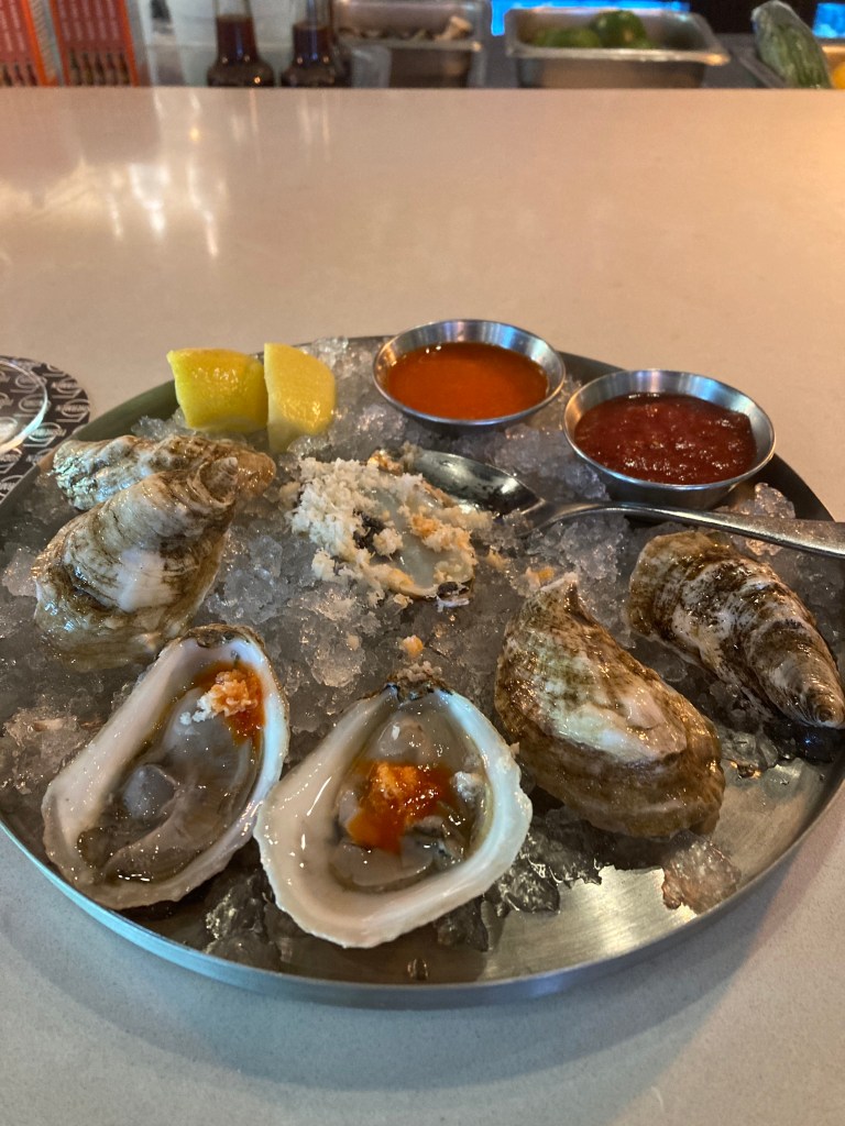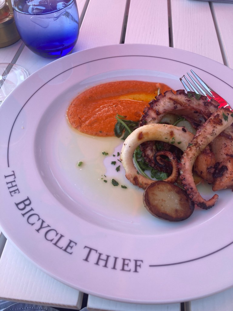 What a wonderful city. The weather has been extraordinarily warm. Great for wandering the city. Not so good for the wild fires in Nova Scotia. As in any city new to me, the question is, “What do they eat”? Fitting for a city that was once the fourth largest port in the British Empire, fish is on the menu. And with a diverse population, there are many different presentations. And so little time. Nice cold water oysters; octopus salad at highly recommended Bicycle Thief, and crab/salt cod cakes. Oysters and fish cakes at Five Fishermen along with some Digby scallops.