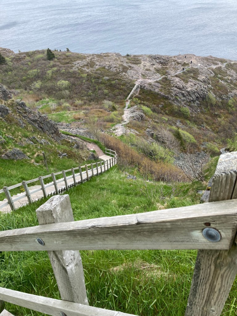 The picture on the left is the start of the trail, from the Cabot Tower parking lot. The middle of the trail did have a sign noting the narrowness and steep fall risk on this section. Still, I can’t imagine they have a US insurance carrier. The picture on the right is the trail turning back toward port, and the town. Signal Hill is the spot that Guglielmo Marconi received the first trans-Atlantic radio transmission in 1901.