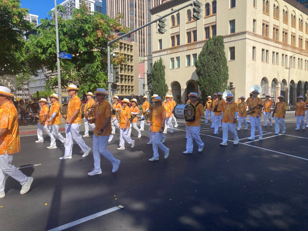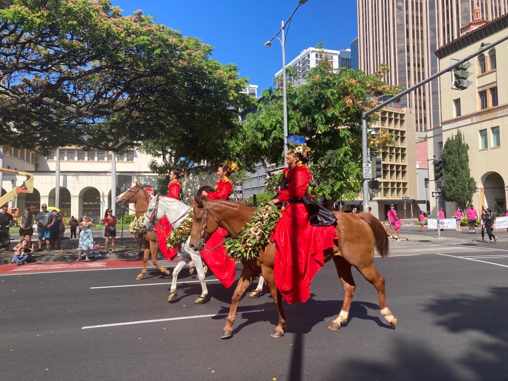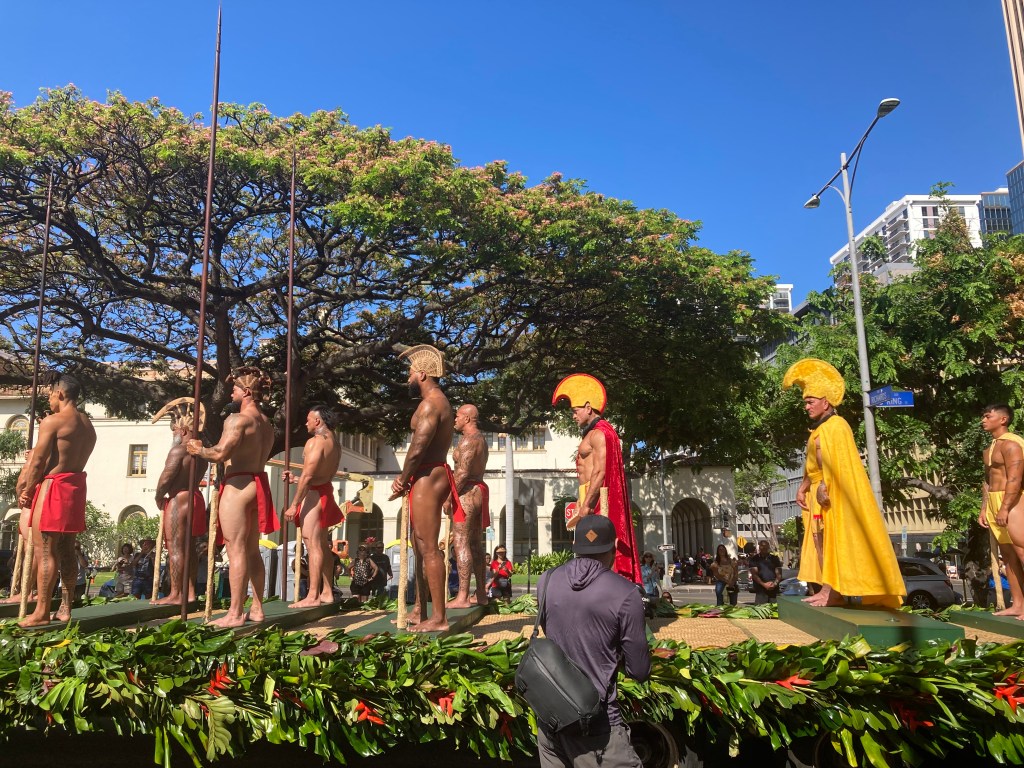 June 11th is King Kamehameha Day. These people have not forgotten that they were a kingdom. On the left is the Royal Hawaiian Band, a state entity. In the center are pa’u riders, an art restored to prominence to celebrate royal traditions. And on the right, a float honoring Kamehameha and his entourage.