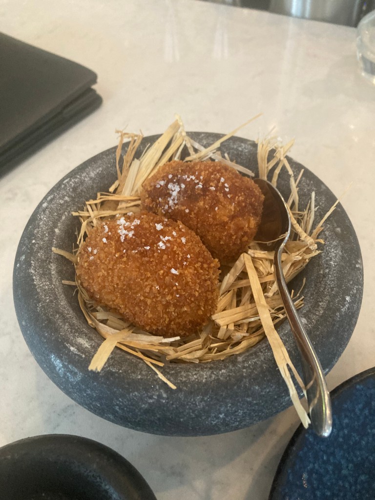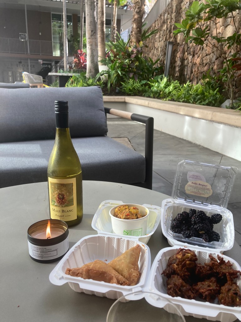 The power has been out in Chinatown for three days. So no traffic lights last night. Lots of road flares to direct traffic. That seems to be in the spirit of things. And while I reflect on Litha, I need to eat. In the center are quail Scotch eggs delightfully presented by Podmore. On the right are samosas, pakora, and fiendishly hot pickles from New Kamana Kitchen. I may only have a small candle, but the pickles set the night ablaze.