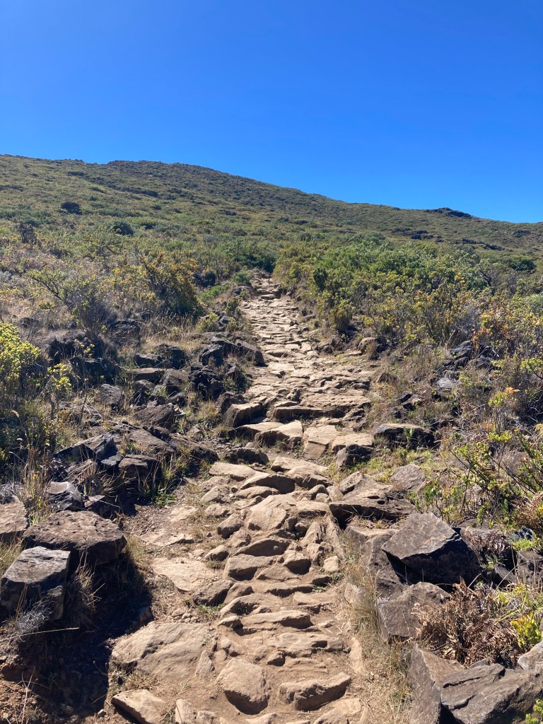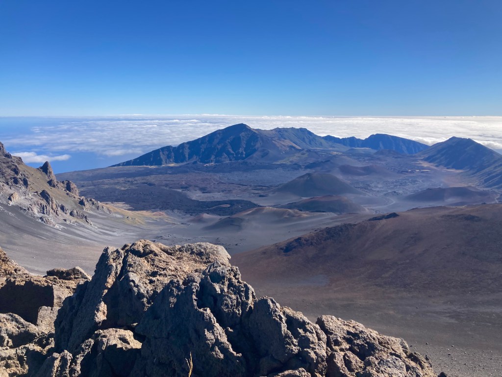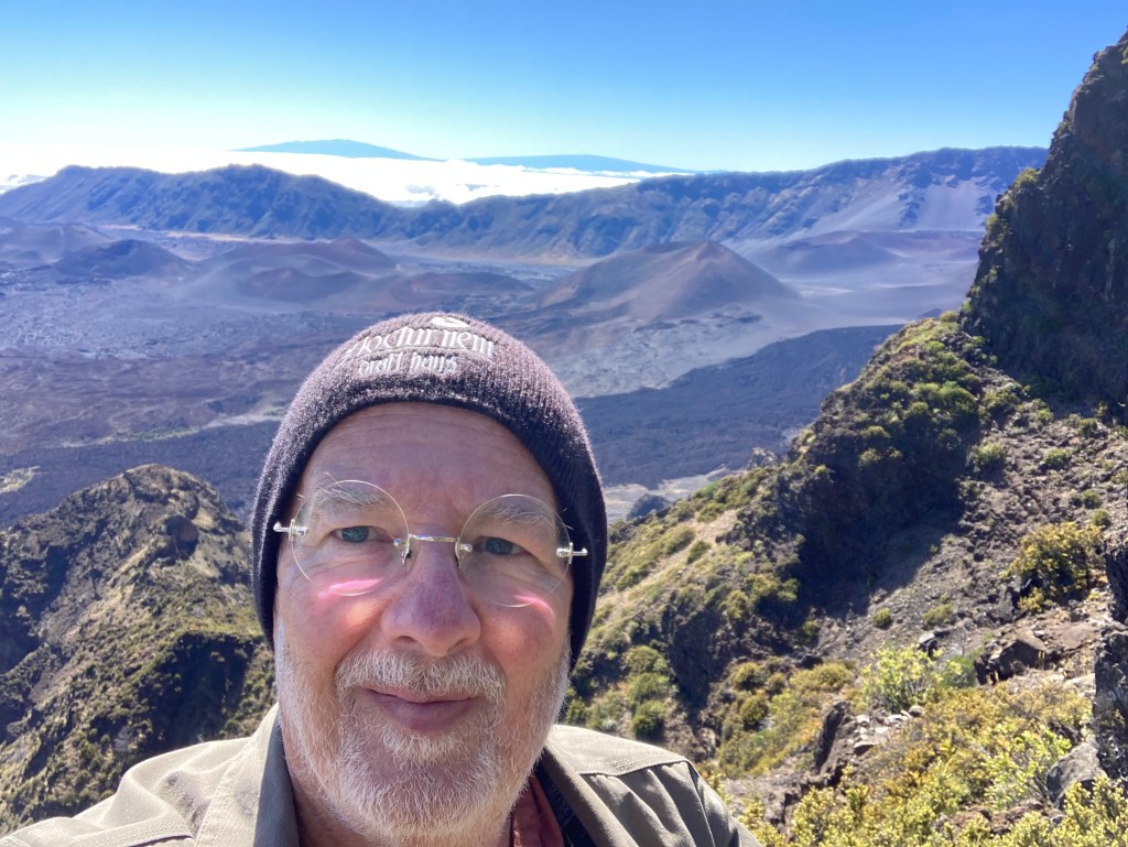 I have been working out of Honolulu for the past several months but recently completed a temporary assignment on Maui. While there, I had the opportunity to spend some time on Haleakalā and in the National Park. The summit is over 10,000 feet, above the cloud level, and spectacularly beautiful. The photo at the left is at the summit, looking down into the caldera. In the middle is āhinahina, or Haleakalā Silversword. Highly endangered, but well conserved in the park. On the right is an example of the trails I stumbled around on for several hours. I went back to the car when multiple groups stopped to offer me water.