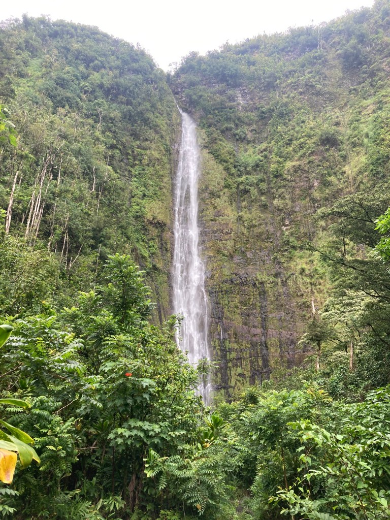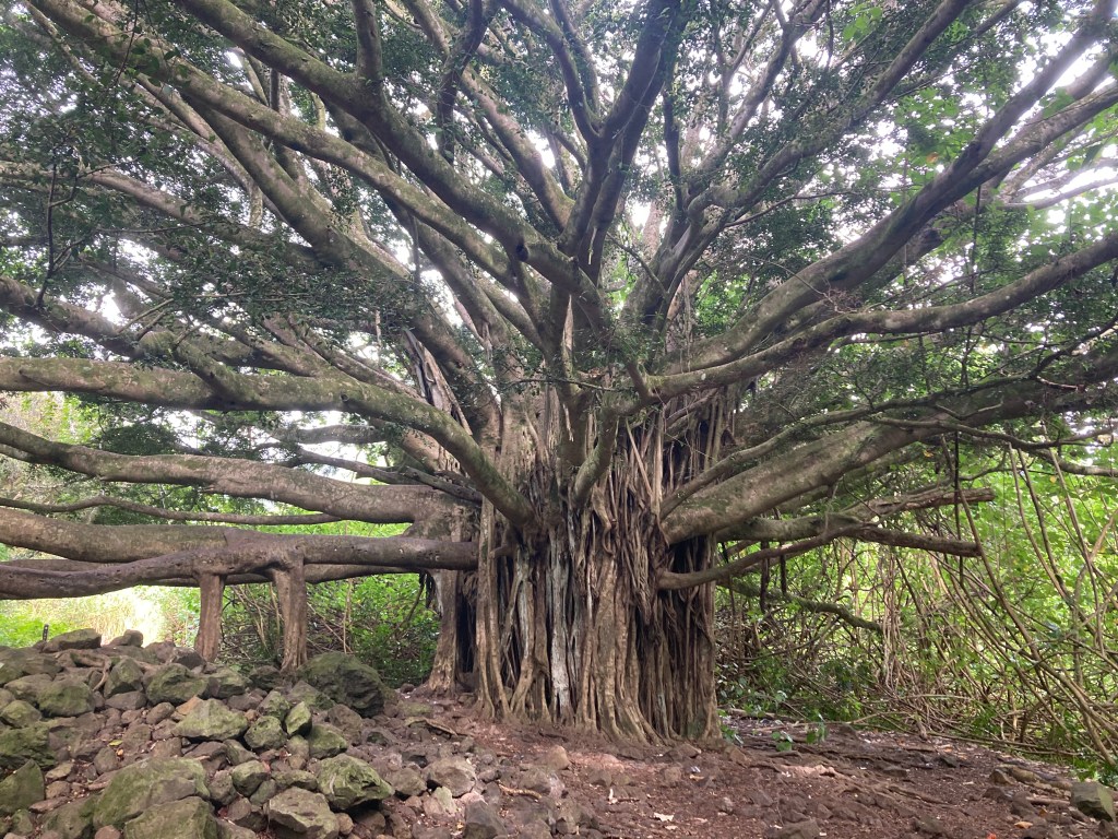 Still in Haleakalā Park, but at lower elevation and on the windward side of Maui. Just south of Hana. Rather than high altitude and arid, this area averages 187 inches of rain annually. On the left is Waimoku waterfall with a height of 400 feet. On the right is a portion of the two mile trail in, and in the center a large banyan at about half way.