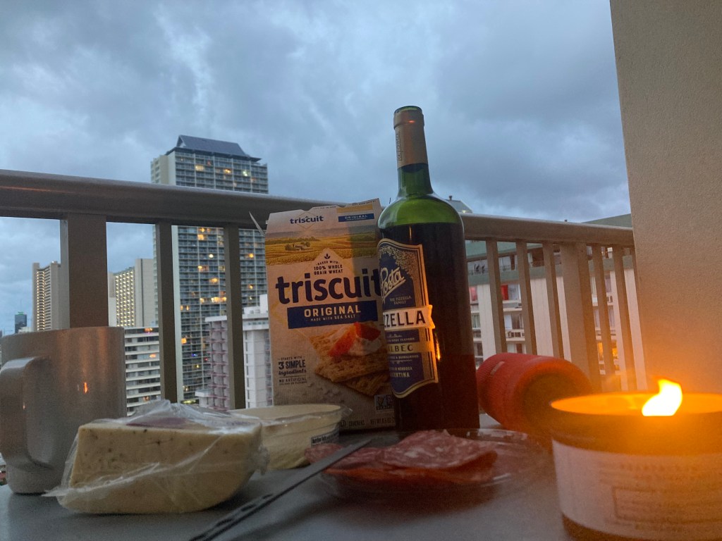 And now I’m back at the start. Sitting on my balcony in Waikiki, the clouds rolling in. Wine, snacks, and tunes, trying to catch up on a blog, and feelings, too long ignored. Merry Yule and Happy Solstice!!